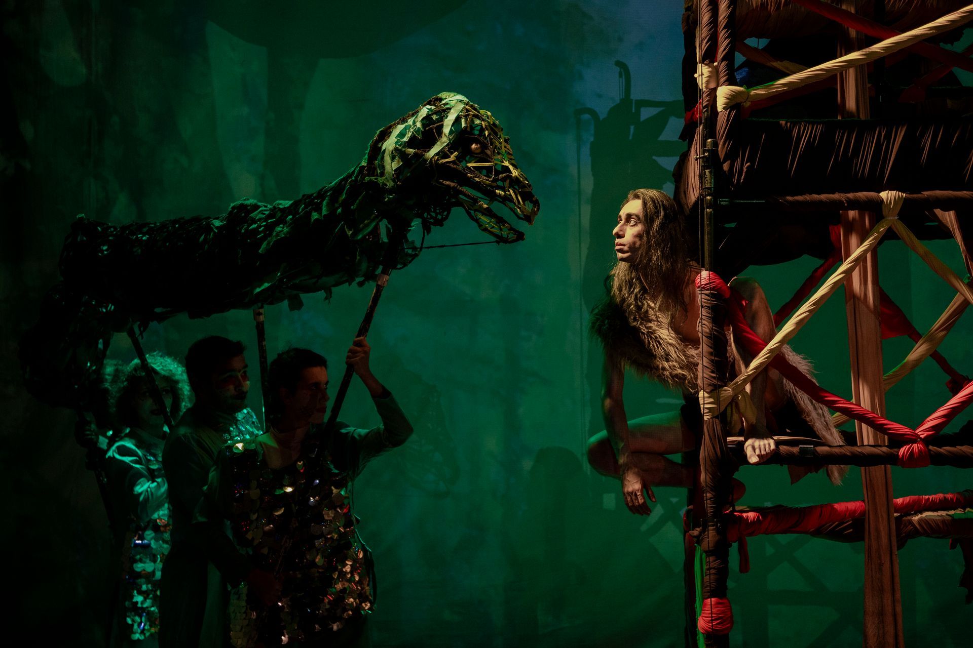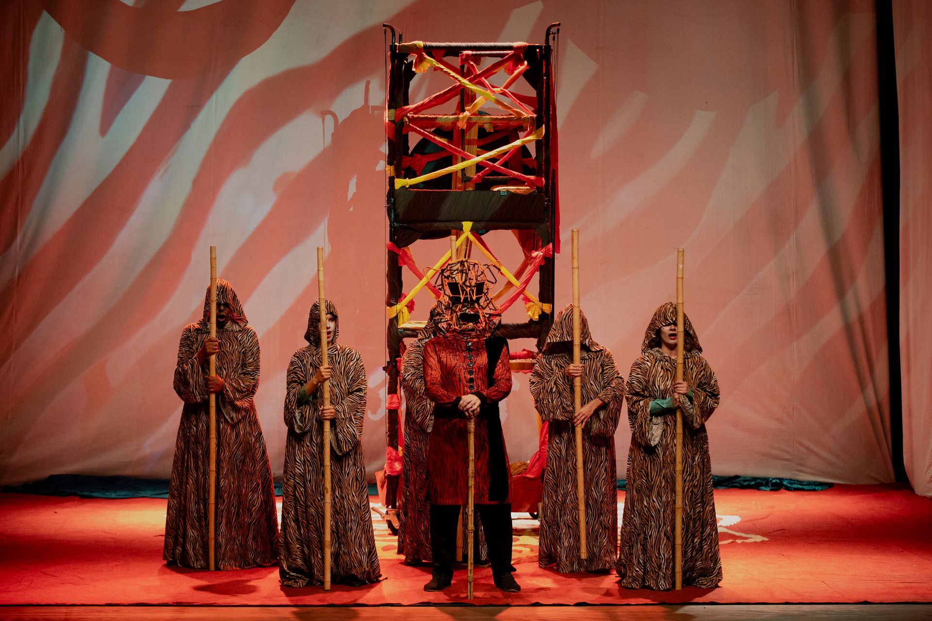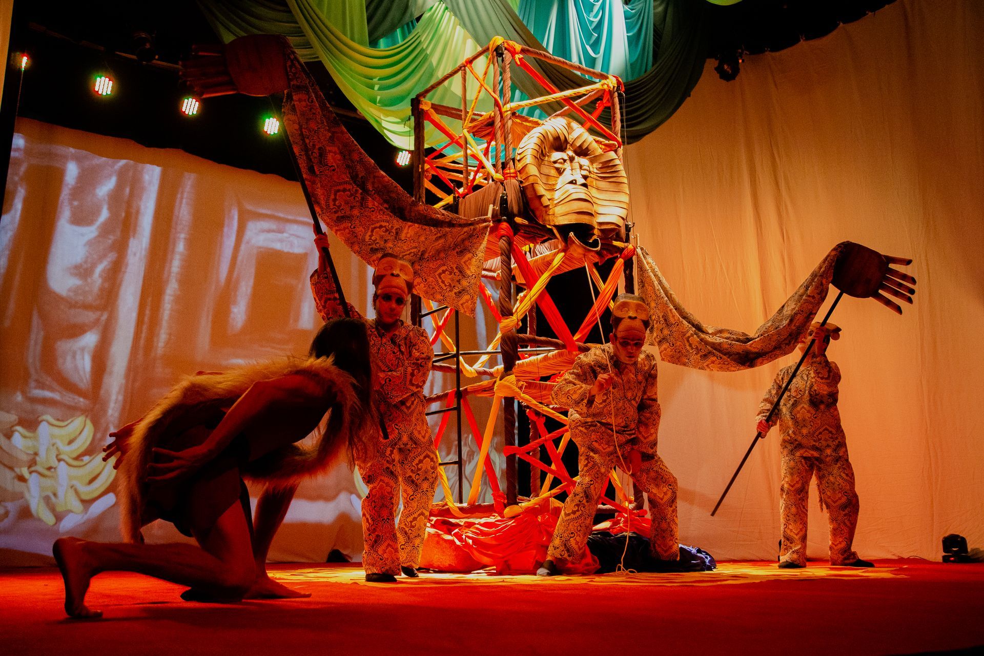 No palco, um elenco de 6 atores se reveza em vários personagens, usando para isto o teatro de sombra, bonecos, comédia, dança e muita música.
